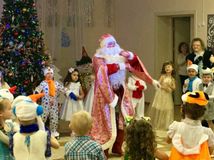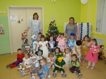 У детей во 2 мл.гр елка оказалась капризной и не хотела зажигаться от привычных «волшебных» слов, пришлось рассмешить. Елочка от смеха зажглась, но тут дети услышали плач, оказалось, что это Снеговик веселился в снегу, кувыркался, и свой нос-морковку потерял. И для того что бы поднять Снеговику настроение, ребята решили поиграть в «снежки». После чего Снеговику предложили примерить нос-снежок, но он к большому сожалению не подошел. Решили помочь Снеговику девочки-елочки, станцевать «Танец маленьких елочек» и предложить носик-елочную шишку, но и она не подошла. Наши задорные ребята не стали отчаиваться и поиграли в музыкальную игру «Лепим Снеговика». И тут, услышав весь этот шум в гости заскочил Зайчик ,который нес в корзинке много морковок, Снеговик увидев их решил одолжить всего одну морковку для носа, однако Заяц пожадничал и хотел сбежать, только ребята его не выпустили. И решил Зайчик остаться на празднике, рассмотреть елочку, только вот он не знал как ее наряжают и тогда дети решили ему показать – поиграть в музыкальную игру «Мы повесим шарики», после чего Зайчик дал одну морковку Снеговику, чему он был очень рад. Но про главного гостя Нового года ни кто не забыл, и стали все ребята дружно звать главного гостя Деда Мороза! Дед Мороз оказался не простым, а волшебником и превратил ребят сначала в зайчиков, потом в лисичек и медвежат, да не все «зверей» у него получилось превратить обратно в ребят, остались сахарные зайчата и шоколадные медвежата, которые станцевали веселый танец, Деду Морозу так понравился танец, что он сам захотел потанцевать с детьми, и так расплясался, что чуть не растаял. Пришлось девочкам-снежинкам срочно спасать Деда Мороза своим танцем. А за это наш главный гость решил поиграть с детьми в игру «Живой сугроб». Играли , играли ребята и нашли под сугробом долгожданные подарки! В старших и подготовительной группах хладнокровная Снежная королева забрала все огоньки с ёлки и спрятала Деда Мороза, в своем ледяном дворце. Тогда дети решили позвать на помощь Кая и Герду: